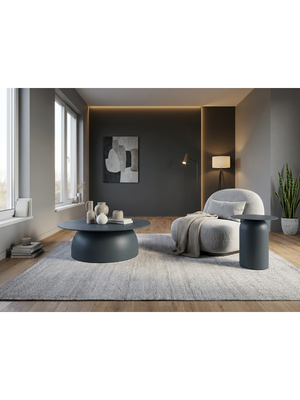 Antrasit gri sehpa seti, modern, endüstriyel ve minimal dekorasyon stilleriyle mükemmel uyum sağlar. Açık tonlu alanlarda güçlü bir kontrast yaratırken, koyu tonlu mekânlarda sofistike ve dengeli bir atmosfer oluşturur.