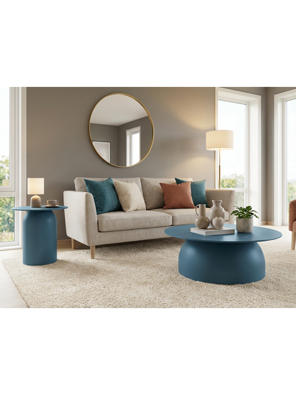 Petrol mavisi sehpa seti, modern, endüstriyel ve çağdaş dekorasyon stilleriyle mükemmel bir uyum sağlar. Derin rengi sayesinde mekâna sofistike, dengeli ve prestijli bir karakter kazandırır.